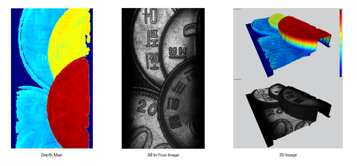 TDI 라인 카메라의 AREA Mode와 WiseScope의 초고속 Z축 가변초점 기술을 융합하여, 라인스캔 방식으로 실시간 3D 이미징, AIF(All- in-Focus) 이미지, 복합 조명 및 층간 분석을 지원합니다.